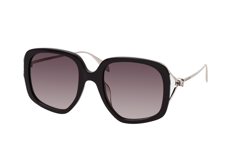 Alexander McQueen AM 0374S 001, Rechteckige Sonnenbrille Damen. Farbe: Schwarz, Größe: Medium, Rahmentyp: FULLFRAME, Brillenbreite: 147mm, Glashöhe: 52mm, Material: Kunststoff/Metall. Stegbreite: 21mm. Glasfarbe: Grau. Mit UV400-Filter. Hersteller: Kering Eyewear DACH GmbH. Style: