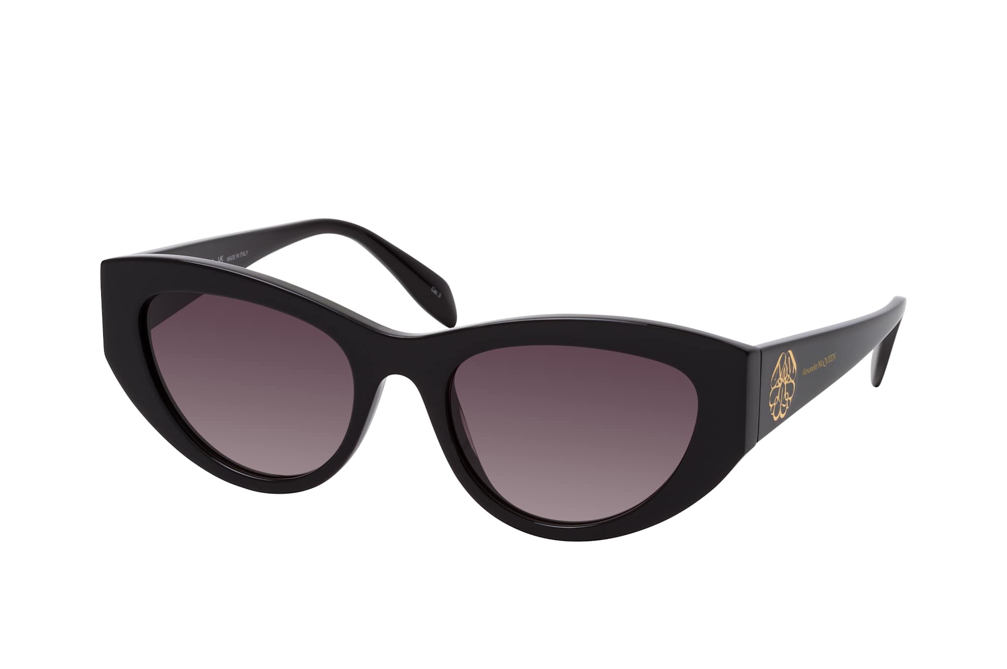 Alexander McQueen AM 0377S 001, Cat Eye Sonnenbrille Damen. Farbe: Schwarz, Größe: Medium, Rahmentyp: FULLFRAME, Brillenbreite: 145mm, Glashöhe: 41mm, Material: Kunststoff. Stegbreite: 19mm. Glasfarbe: Grau. Mit UV400-Filter. Hersteller: Kering Eyewear DACH GmbH. Style: MODERN