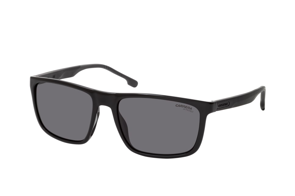 Carrera CARRERA 8047/S 807, Rechteckige Sonnenbrille Herren. Farbe: Schwarz, Größe: Medium, Rahmentyp: FULLFRAME, Brillenbreite: 144mm, Glashöhe: 42mm, Material: Kunststoff. Stegbreite: 18mm. Glasfarbe: Grau. Mit UV400-Filter. Hersteller: Safilo GmbH. Style: CLASSIC