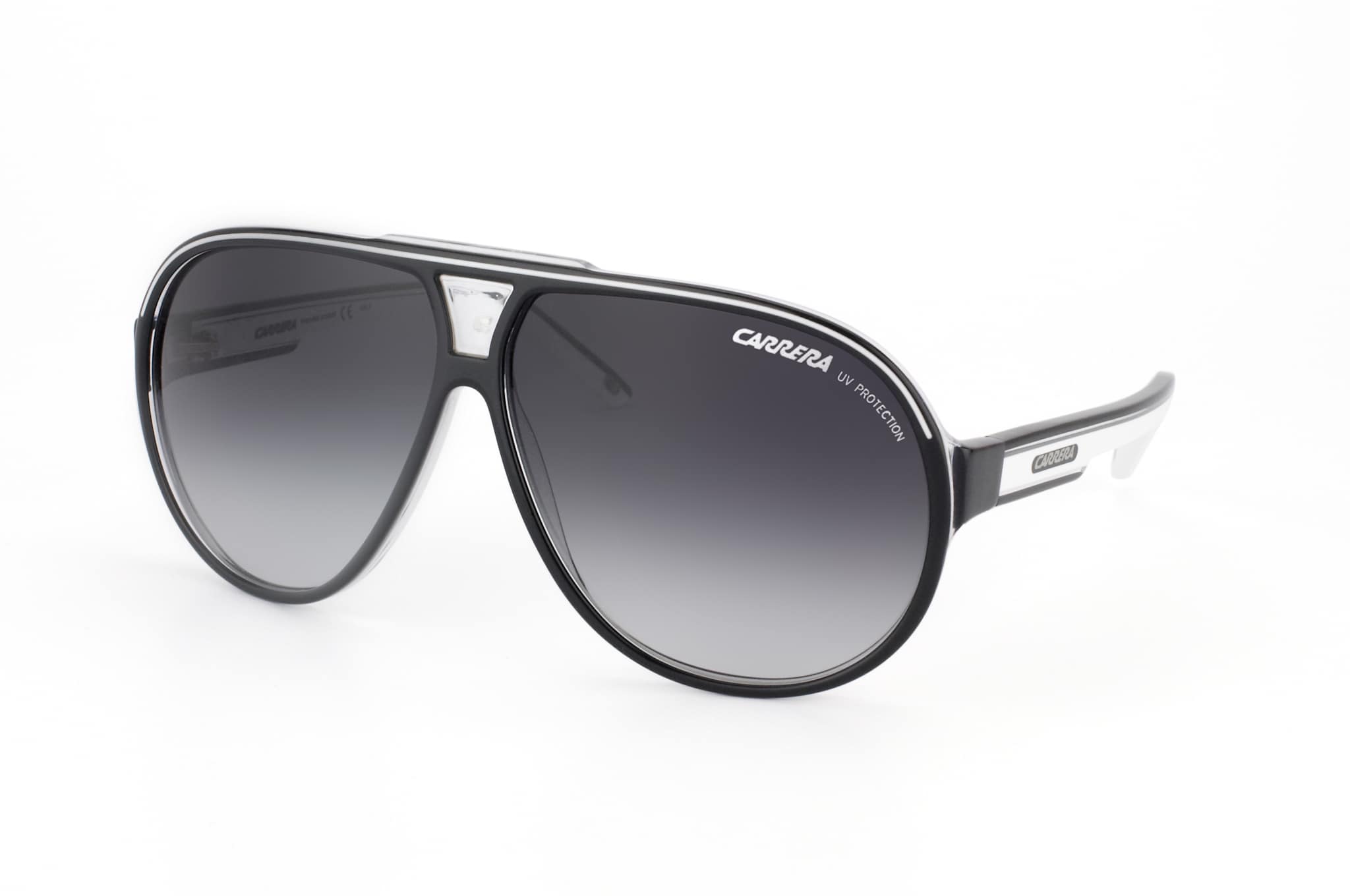 Carrera Grand Prix 1 T4M, Aviator Sonnenbrille Herren. Farbe: Schwarz, Größe: Medium, Rahmentyp: FULLFRAME, Brillenbreite: 142mm, Glashöhe: 53mm, Material: Kunststoff. Stegbreite: 10mm. Glasfarbe: Grau. Mit UV400-Filter. Hersteller: Safilo GmbH. Style: CLASSIC