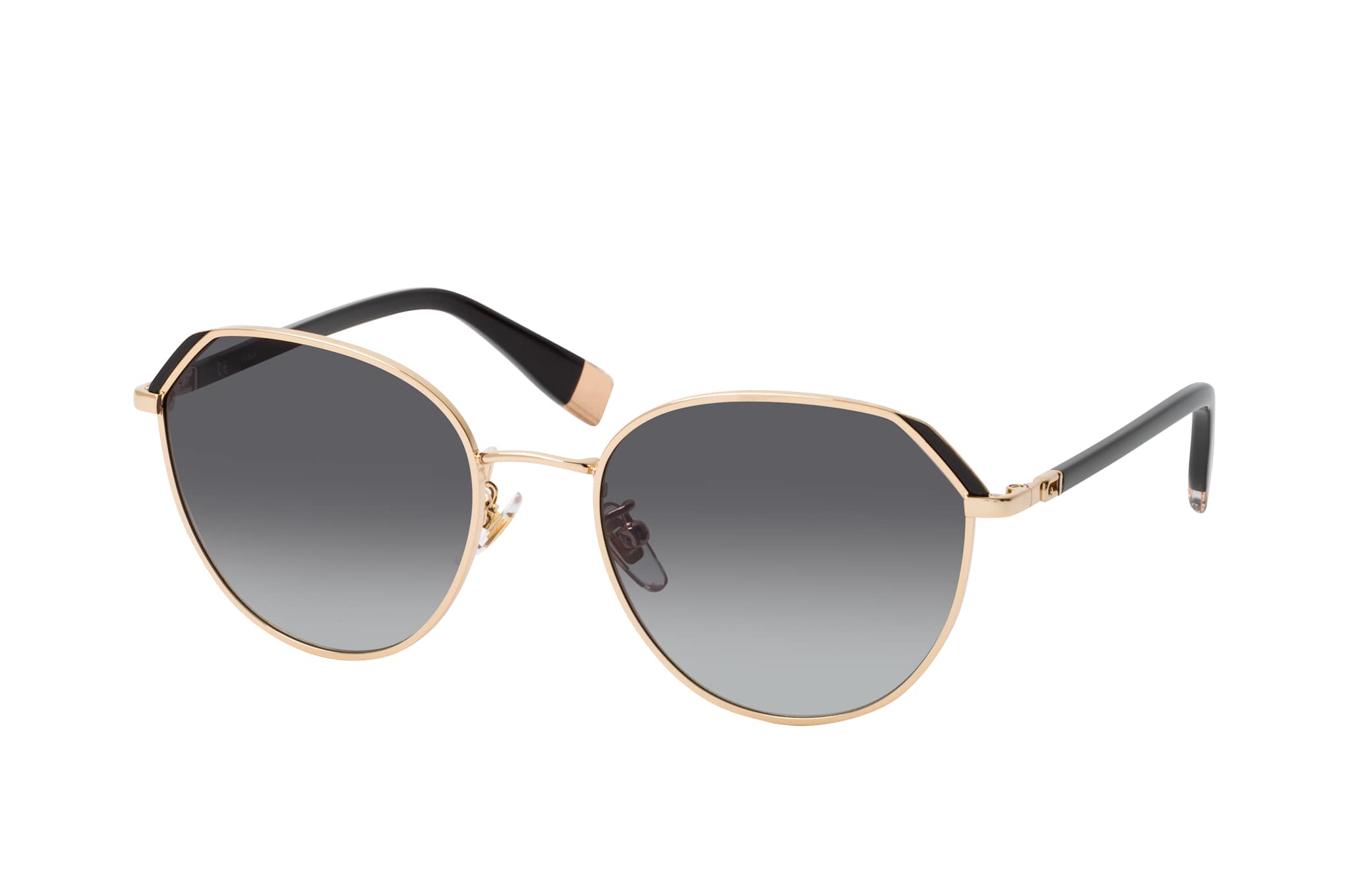 Furla SFU 513 0301, Runde Sonnenbrille Damen. Farbe: Goldfarben, Größe: Medium, Rahmentyp: FULLFRAME, Brillenbreite: 138mm, Glashöhe: 49mm, Material: Metall. Stegbreite: 19mm. Glasfarbe: Grau. Mit UV400-Filter. Hersteller: De Rigo Vision S.p.A. Style: MODERN