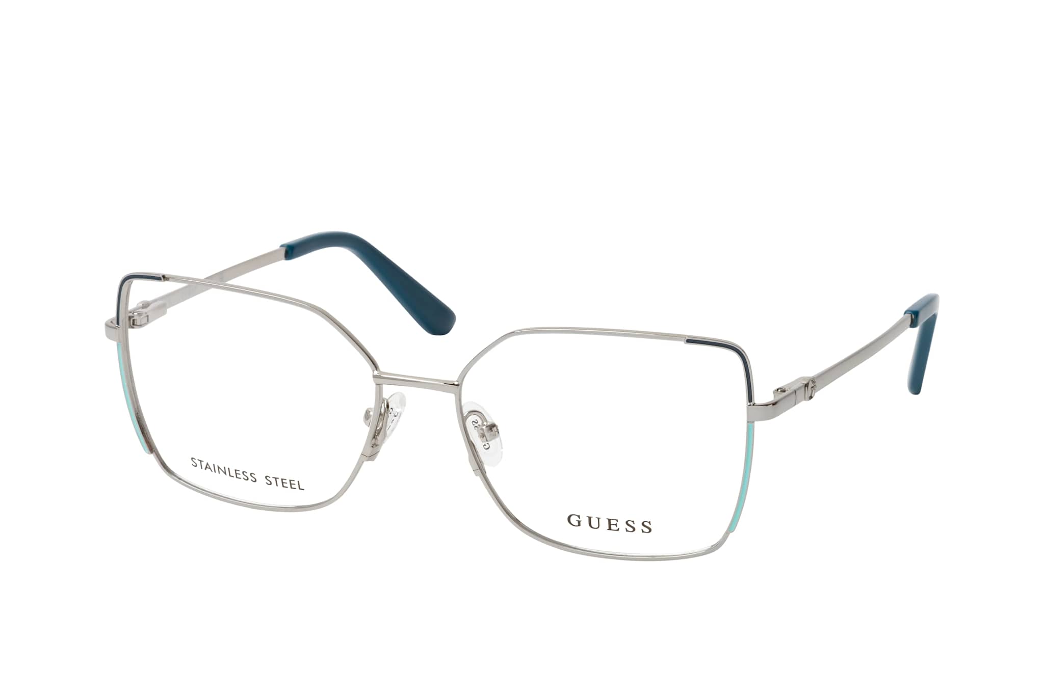 Guess GU50223 010, Quadratische Brille Damen. Farbe: Silber, Größe: Medium, Rahmentyp: FULLFRAME, Brillenbreite: 135mm, Glashöhe: 44mm, Material: Metall. Stegbreite: 16mm. Glasfarbe: . Glasmaterial: Metall/Metall.Hersteller: Marcolin (Deutschland) GmbH. Style: