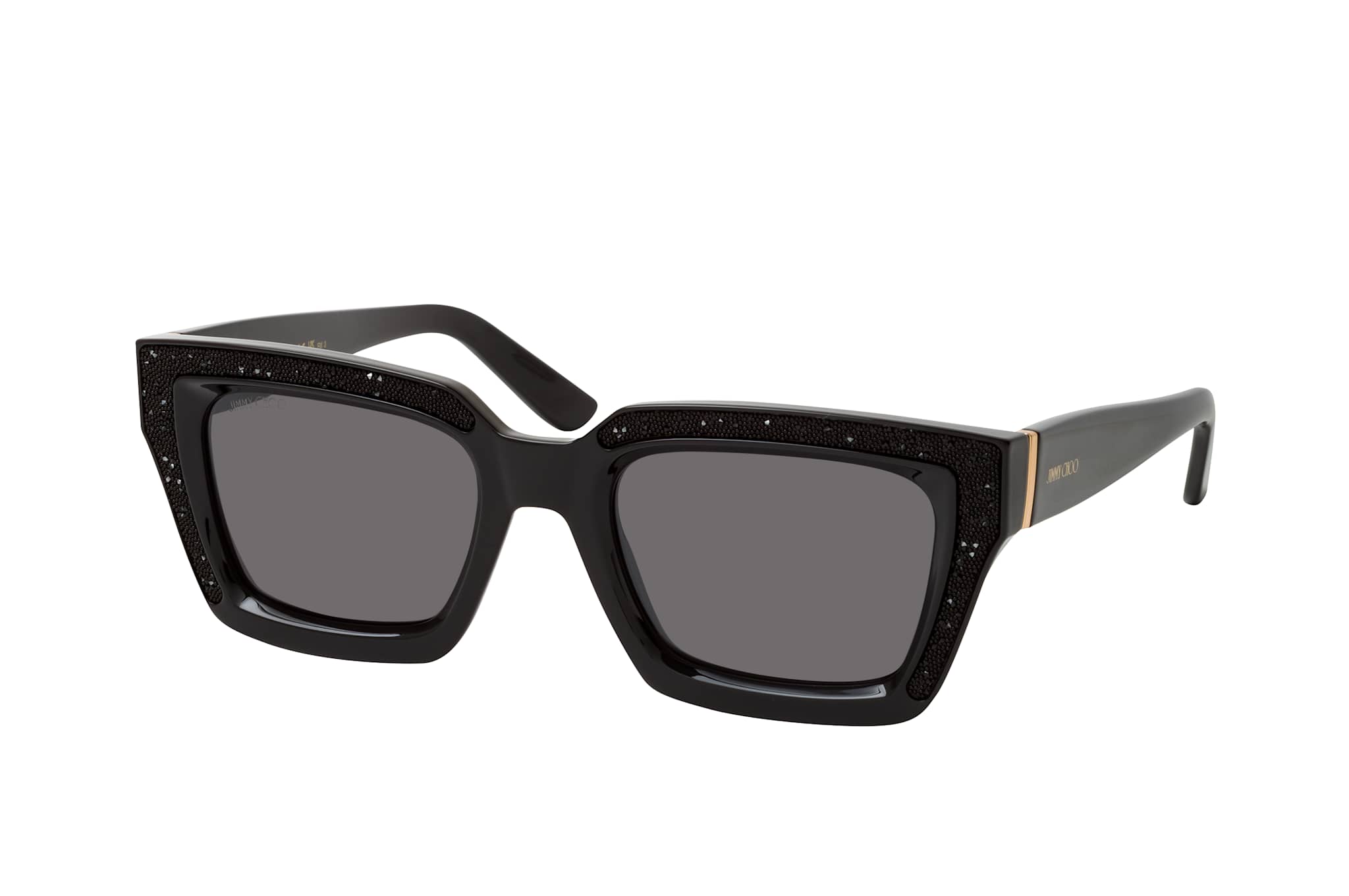 Jimmy Choo MEGS/S 807, Quadratische Sonnenbrille Damen. Farbe: Schwarz, Größe: Medium, Rahmentyp: FULLFRAME, Brillenbreite: 144mm, Glashöhe: 37mm, Material: Kunststoff. Stegbreite: 21mm. Glasfarbe: Grau. Mit UV400-Filter. Hersteller: Safilo GmbH. Style:
