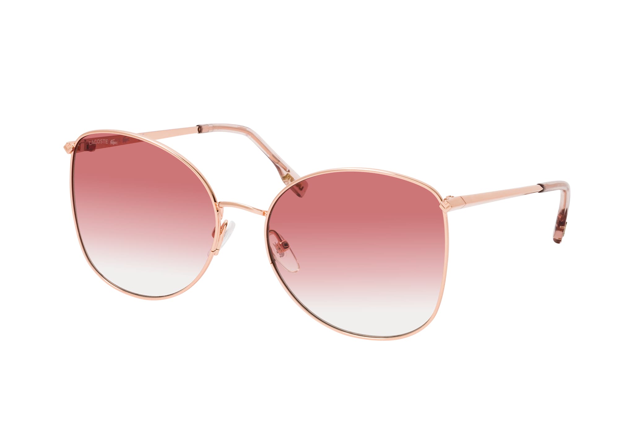 Lacoste L 224S 757, Cat Eye Sonnenbrille Damen. Farbe: Roségold, Größe: Medium, Rahmentyp: FULLFRAME, Brillenbreite: 138mm, Glashöhe: 55mm, Material: Metall. Stegbreite: 18mm. Glasfarbe: Rosa. Mit UV400-Filter. Hersteller: Marchon Germany GmbH. Style: MODERN