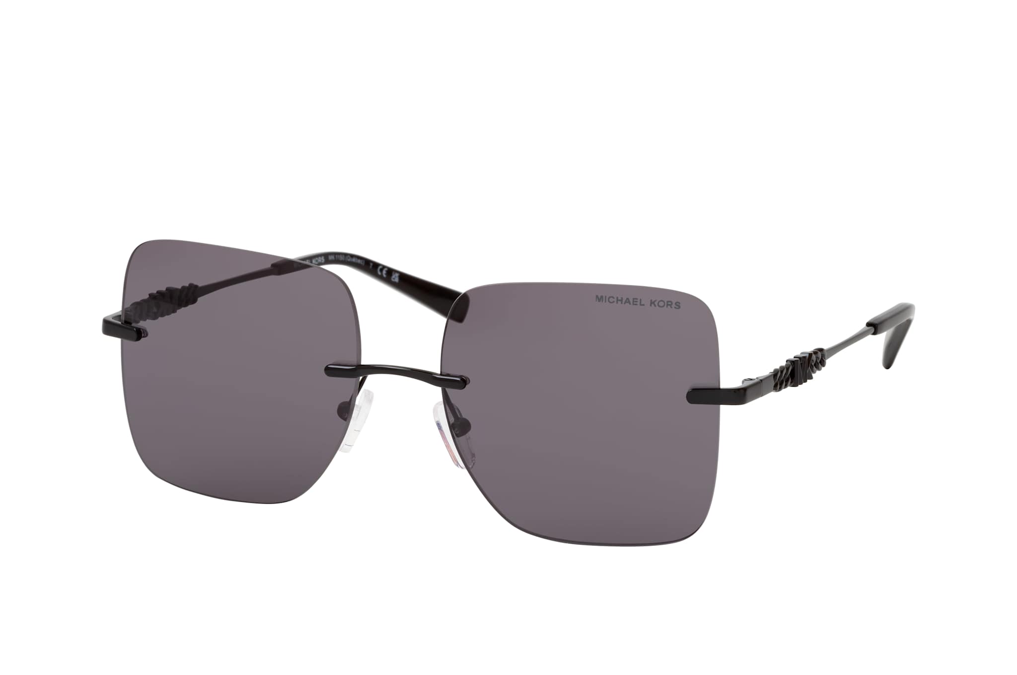 Michael Kors MK 1150 1005/1, Quadratische Sonnenbrille Damen. Farbe: Schwarz, Größe: Medium, Rahmentyp: FRAMELESS, Brillenbreite: 136mm, Glashöhe: 52mm, Material: Metall. Stegbreite: 17mm. Glasfarbe: Grau. Mit UV400-Filter. Hersteller: Luxottica Group S.p.A. Style: