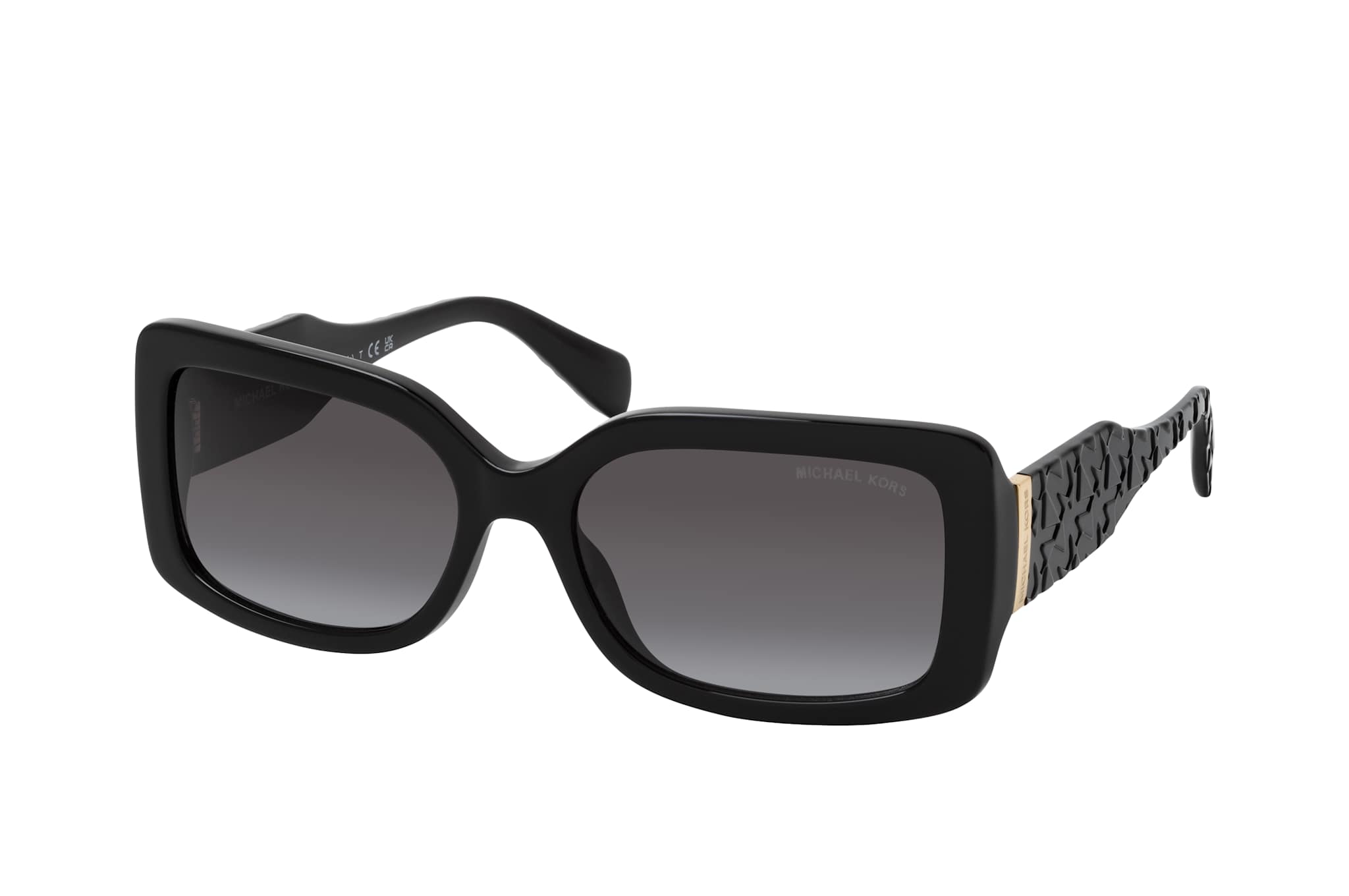 Michael Kors MK 2165 30058G, Rechteckige Sonnenbrille Damen. Farbe: Schwarz, Größe: Medium, Rahmentyp: FULLFRAME, Brillenbreite: 142mm, Glashöhe: 39mm, Material: Kunststoff. Stegbreite: 17mm. Glasfarbe: Grau. Mit UV400-Filter. Hersteller: Luxottica Group S.p.A. Style: