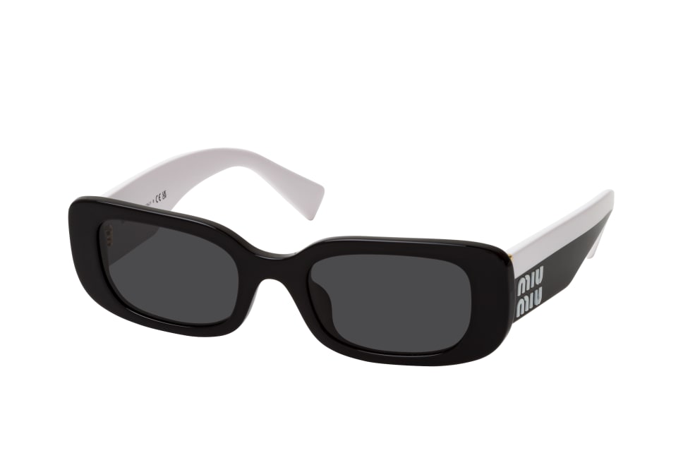 Miu Miu MU 08YS 1AB5S0, Rechteckige Sonnenbrille Damen. Farbe: Schwarz, Größe: Medium, Rahmentyp: FULLFRAME, Brillenbreite: 138mm, Glashöhe: 34mm, Material: Kunststoff. Stegbreite: 21mm. Glasfarbe: Grau. Mit UV400-Filter. Hersteller: Luxottica Fashion Brillen Vertriebs GmbH. Style:
