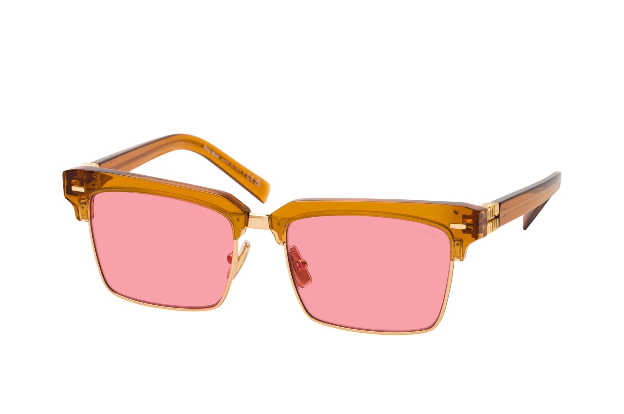 Miu Miu MU 10ZS 15T1D0, Quadratische Sonnenbrille Damen. Farbe: Braun, Größe: Medium, Rahmentyp: FULLFRAME, Brillenbreite: 142mm, Glashöhe: 39mm, Material: Metall/Kunststoff. Stegbreite: 17mm. Glasfarbe: Lila. Mit UV400-Filter. Hersteller: Luxottica Group S.p.A. Style:
