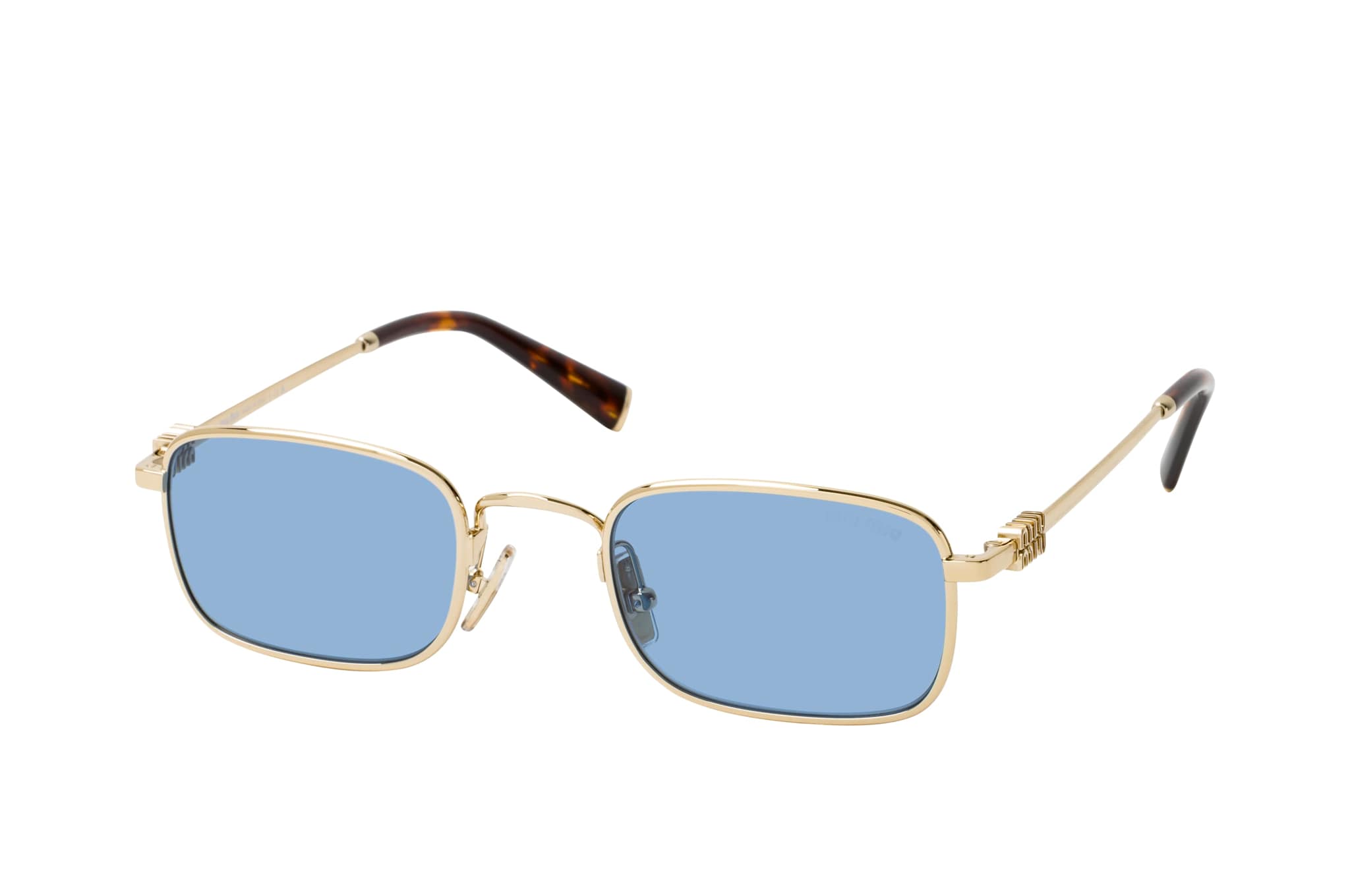 Miu Miu MU A53S ZVN60O, Quadratische Sonnenbrille Damen. Farbe: Goldfarben, Größe: Medium, Rahmentyp: FULLFRAME, Brillenbreite: 130mm, Glashöhe: 35mm, Material: Metall. Stegbreite: 22mm. Glasfarbe: Blau. Mit UV400-Filter. Hersteller: Luxottica Group S.p.A. Style: