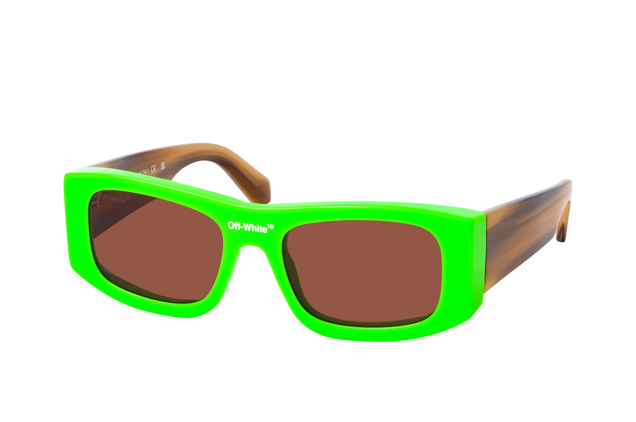 Off-White LUCIO OERI039 5964, Rechteckige Sonnenbrille Unisex. Farbe: Grün, Größe: Medium, Rahmentyp: FULLFRAME, Brillenbreite: 145mm, Glashöhe: 38mm, Material: Kunststoff. Stegbreite: 19mm. Glasfarbe: Braun. Mit UV400-Filter. Hersteller: New Guards. Style: