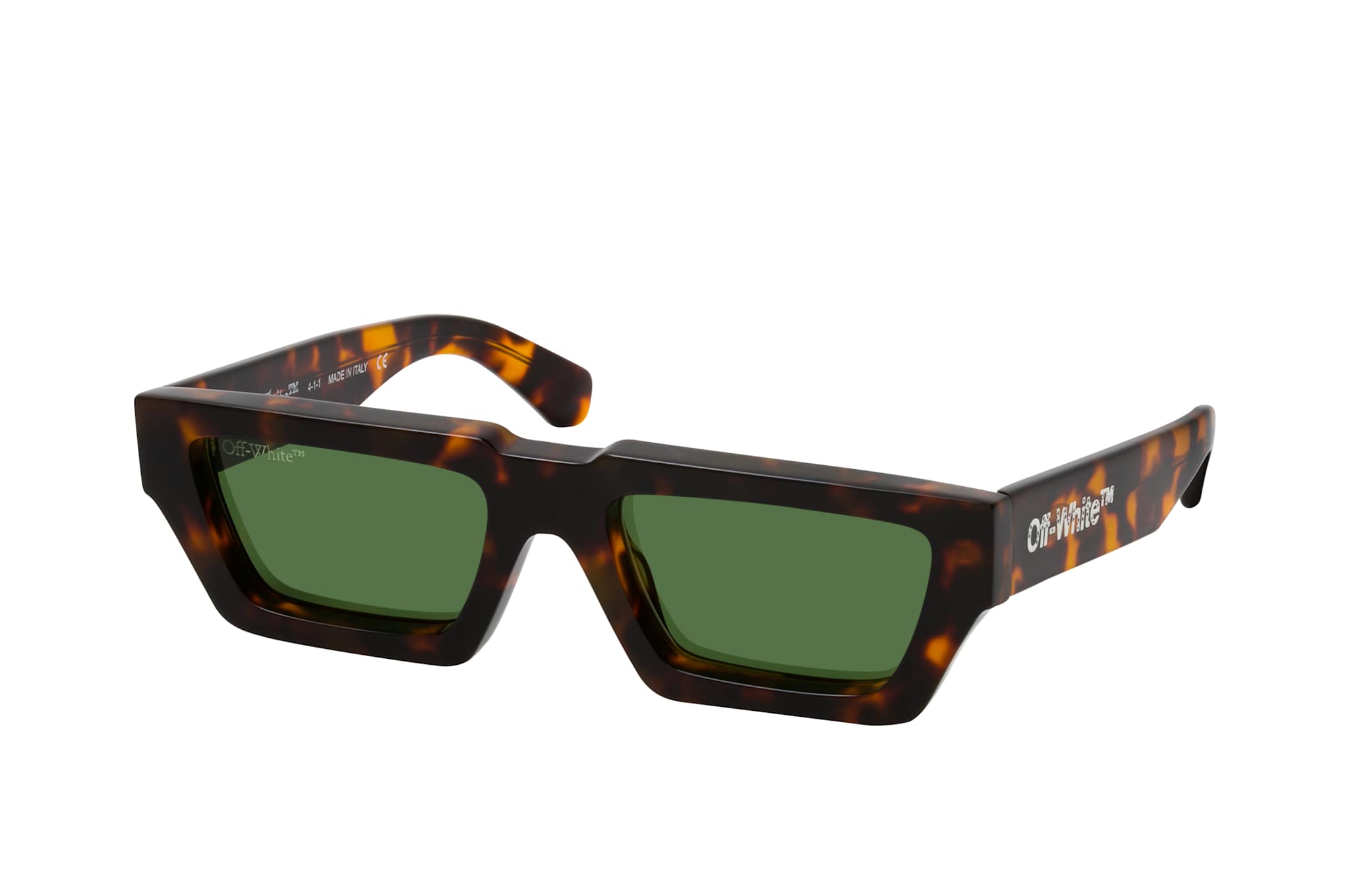 Off-White MANCHESTER OERI002 6055, Rechteckige Sonnenbrille Unisex. Farbe: Havana, Größe: Medium, Rahmentyp: FULLFRAME, Brillenbreite: 144mm, Glashöhe: 31mm, Material: Kunststoff. Stegbreite: 19mm. Glasfarbe: Grün. Mit UV400-Filter. Hersteller: New Guards. Style: EXTRAVAGANT