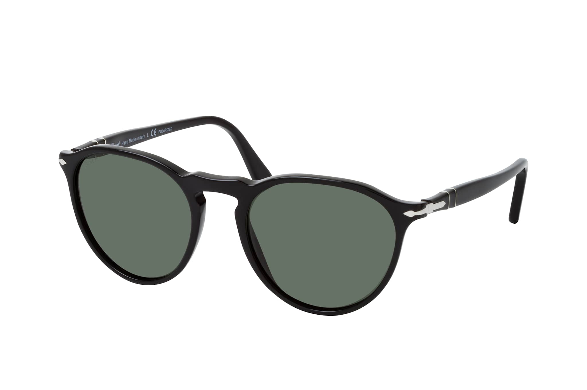 Persol PO 3286S 95/58, Runde Sonnenbrille Unisex. Farbe: Schwarz, Größe: Medium, Rahmentyp: FULLFRAME, Brillenbreite: 134mm, Glashöhe: 46mm, Material: Kunststoff. Stegbreite: 19mm. Glasfarbe: Grün. Mit UV400-Filter. Hersteller: Luxottica Group S.p.A. Style: MODERN