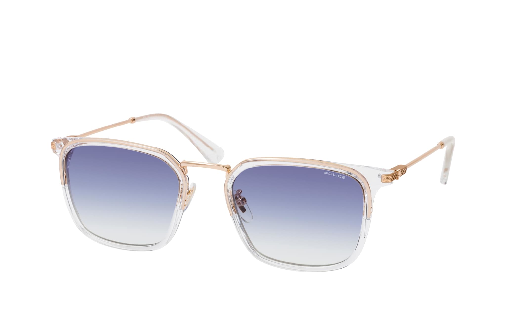 Police SPLP 27 300K, Quadratische Sonnenbrille Herren. Farbe: Goldfarben, Größe: Medium, Rahmentyp: FULLFRAME, Brillenbreite: 145mm, Glashöhe: 41mm, Material: Kunststoff. Stegbreite: 21mm. Glasfarbe: Blau. Mit UV400-Filter. Hersteller: De Rigo Vision S.p.A. Style: