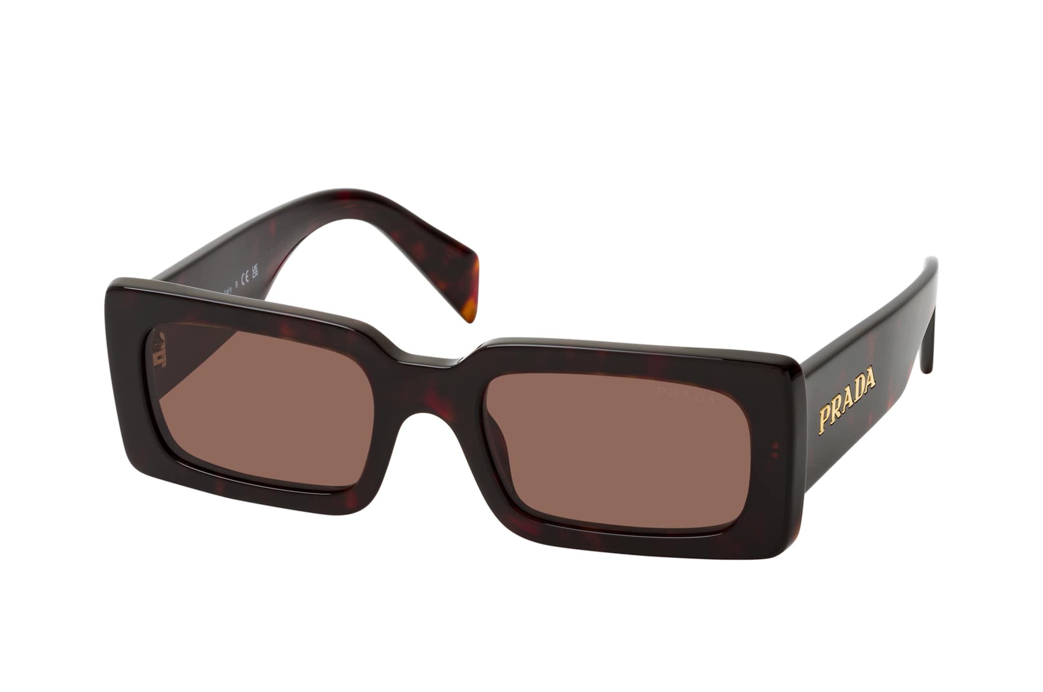 Prada 0PR A07S 16N5Y1, Rechteckige Sonnenbrille Damen. Farbe: Havana, Größe: Medium, Rahmentyp: FULLFRAME, Brillenbreite: 138mm, Glashöhe: 33mm, Material: Kunststoff. Stegbreite: 20mm. Glasfarbe: Braun. Mit UV400-Filter. Hersteller: Luxottica Group S.p.A. Style: