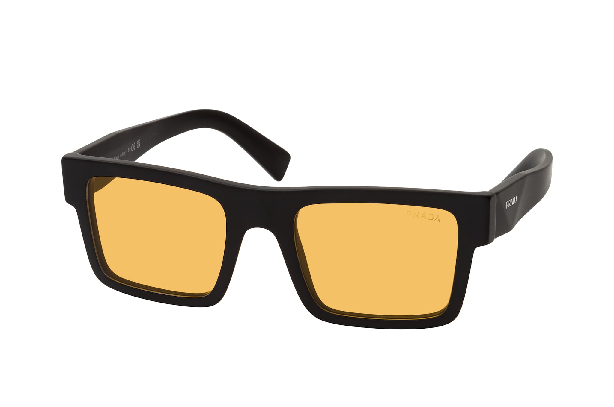 Prada PR 19WS 1BO0B7, Quadratische Sonnenbrille Herren. Farbe: Schwarz, Größe: Medium, Rahmentyp: FULLFRAME, Brillenbreite: 141mm, Glashöhe: 39mm, Material: Kunststoff. Stegbreite: 21mm. Glasfarbe: Gelb. Mit UV400-Filter. Hersteller: Luxottica Group S.p.A. Style: