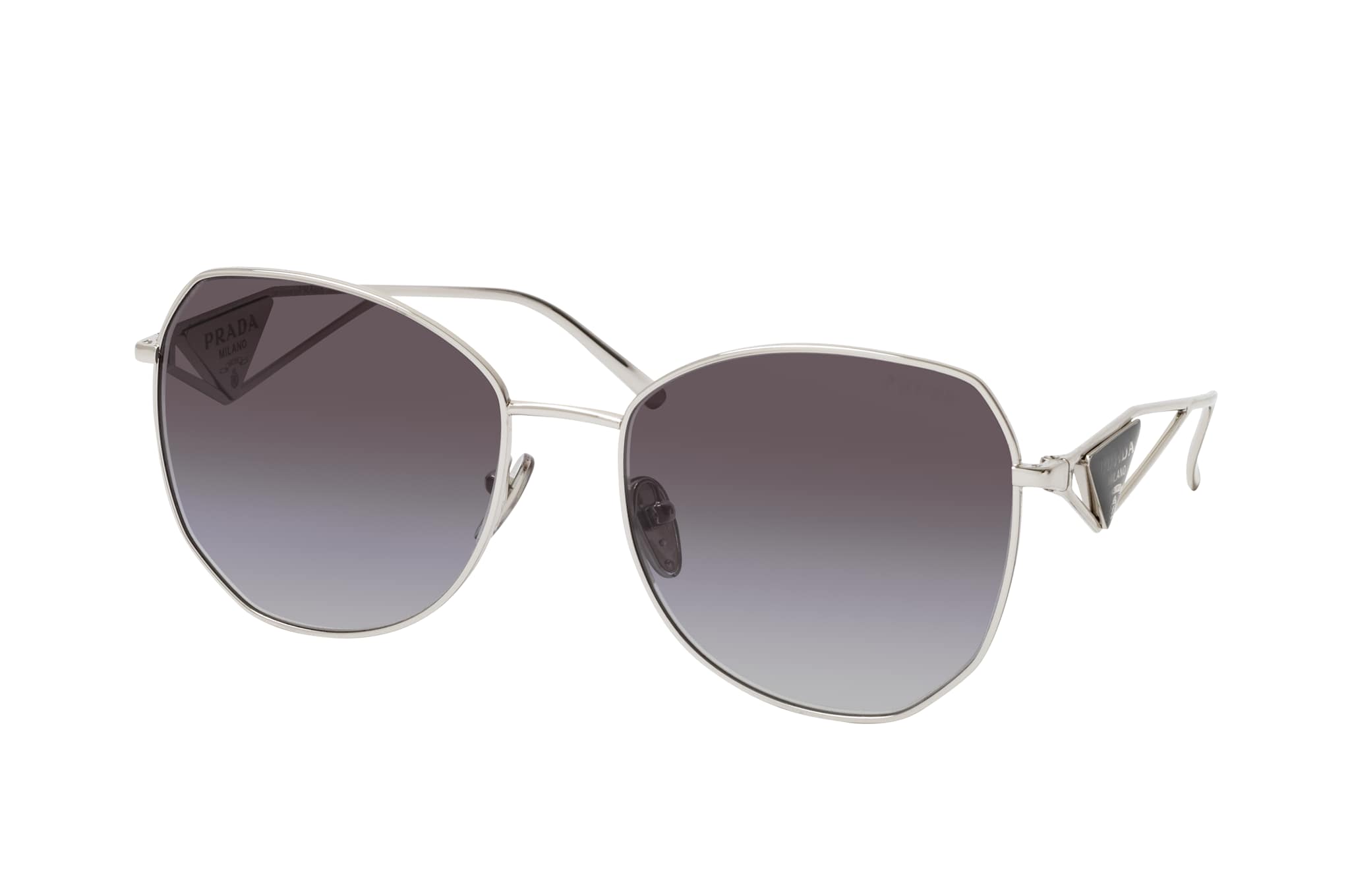 Prada PR 57YS 1BC5D1, Runde Sonnenbrille Damen. Farbe: Silber, Größe: Medium, Rahmentyp: FULLFRAME, Brillenbreite: 141mm, Glashöhe: 53mm, Material: Metall. Stegbreite: 18mm. Glasfarbe: Grau. Mit UV400-Filter. Hersteller: Luxottica Group S.p.A. Style: MODERN