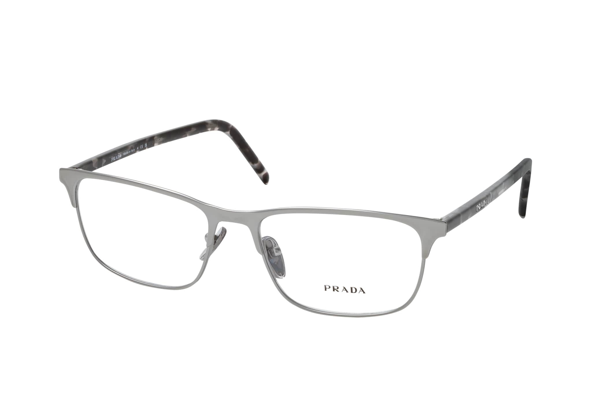 Prada PR 66YV 7CQ1O1, Rechteckige Brille Herren. Farbe: Silber, Größe: Medium, Rahmentyp: FULLFRAME, Brillenbreite: 139mm, Glashöhe: 37mm, Material: Metall/Kunststoff. Stegbreite: 17mm. Glasfarbe: . Glasmaterial: Kunststoff/Metall.Hersteller: Luxottica Group S.p.A. Style: CLASSIC