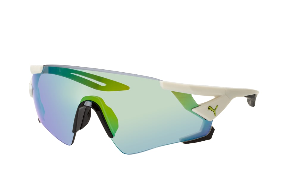 Puma PU 0398S 003, Sonnenbrille Unisex. Farbe: Weiss, Größe: Medium, Rahmentyp: FRAMELESS, Brillenbreite: 150mm, Glashöhe: 59mm, Material: Kunststoff. Stegbreite: 0mm. Glasfarbe: Lila. Mit UV400-Filter. Hersteller: Kering Eyewear DACH GmbH. Style: