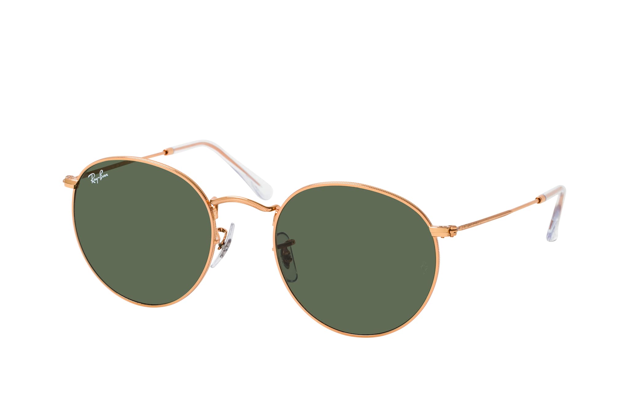 Ray-Ban RB 3447 920231, Runde Sonnenbrille Herren. Farbe: Roségold, Größe: Medium, Rahmentyp: FULLFRAME, Brillenbreite: 135mm, Glashöhe: 49mm, Material: Metall. Stegbreite: 21mm. Glasfarbe: Grün. Mit UV400-Filter. Hersteller: Luxottica Group S.p.A. Style: