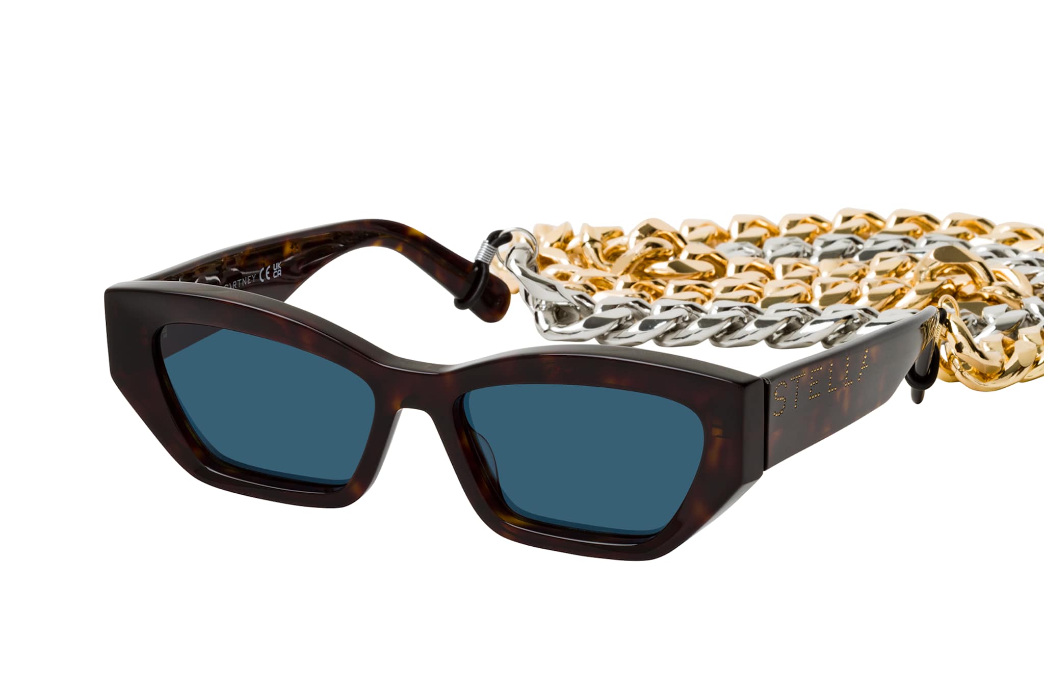Stella McCartney SC 40047 I-Y 5452V, Cat Eye Sonnenbrille Damen. Farbe: Havana, Größe: Medium, Rahmentyp: FULLFRAME, Brillenbreite: 143mm, Glashöhe: 32mm, Material: Kunststoff. Stegbreite: 16mm. Glasfarbe: Blau. Mit UV400-Filter. Hersteller: Thelios. Style: