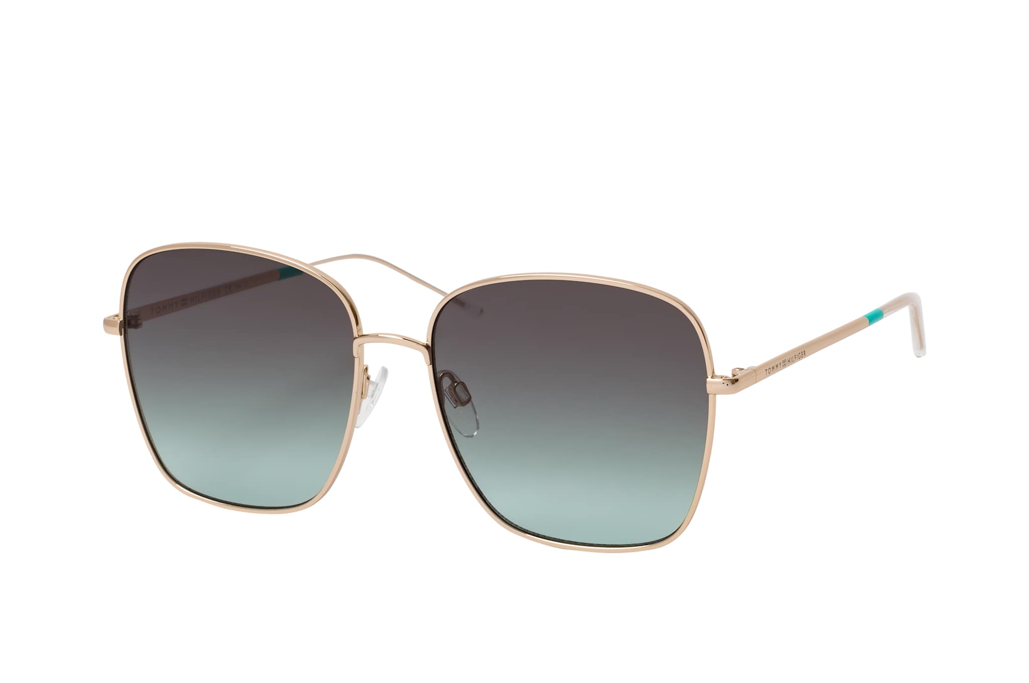 Tommy Hilfiger TH 1648/S PEF, Quadratische Sonnenbrille Damen. Farbe: Goldfarben, Größe: Medium, Rahmentyp: FULLFRAME, Brillenbreite: 143mm, Glashöhe: 56mm, Material: Metall. Stegbreite: 16mm. Glasfarbe: Grün. Mit UV400-Filter. Hersteller: Safilo GmbH. Style: EXTRAVAGANT