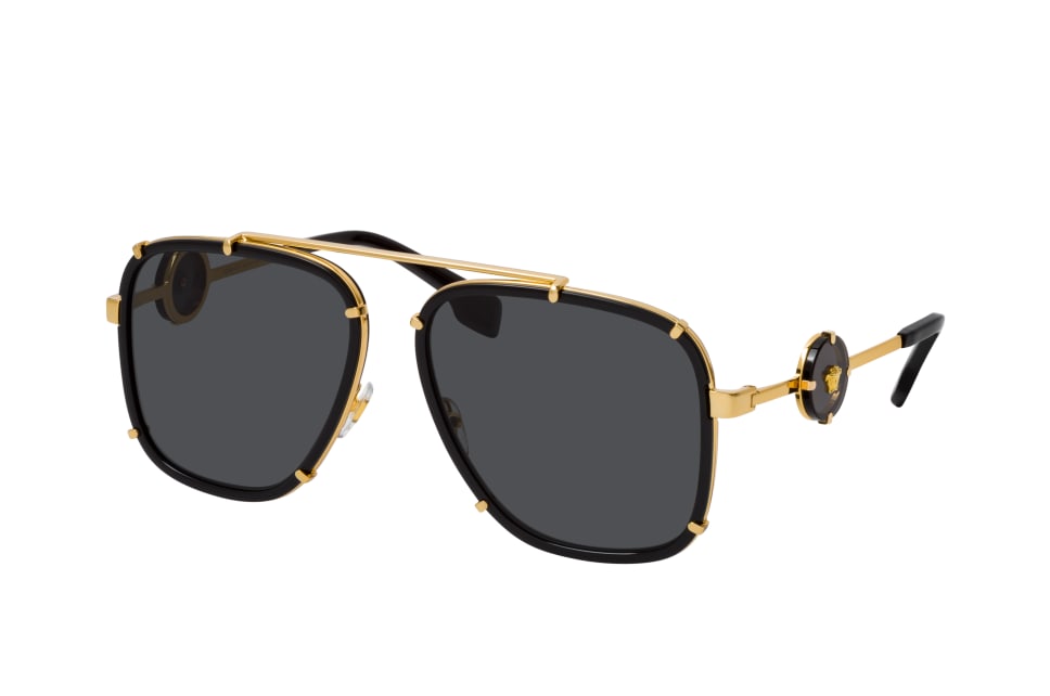 Versace VE 2233 143887, Quadratische Sonnenbrille Herren. Farbe: Schwarz, Größe: Medium, Rahmentyp: FULLFRAME, Brillenbreite: 148mm, Glashöhe: 53mm, Material: Kunststoff/Metall. Stegbreite: 16mm. Glasfarbe: Grau. Mit UV400-Filter. Hersteller: Luxottica Fashion Brillen Vertriebs GmbH. Style: EXTRAVAGANT