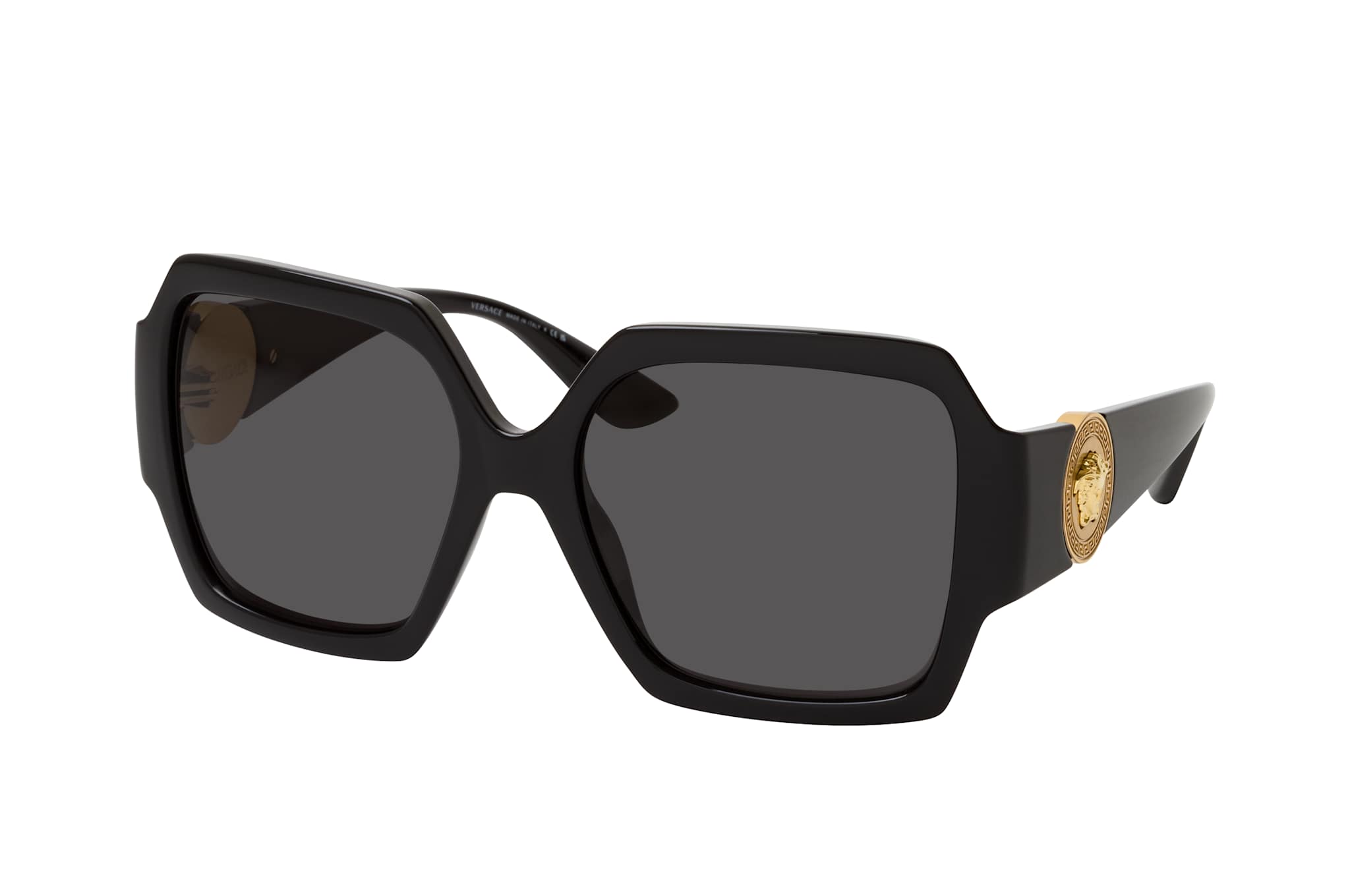 Versace VE 4453 GB1/87, Quadratische Sonnenbrille Damen. Farbe: Schwarz, Größe: Medium, Rahmentyp: FULLFRAME, Brillenbreite: 144mm, Glashöhe: 51mm, Material: Kunststoff/Metall. Stegbreite: 17mm. Glasfarbe: Grau. Mit UV400-Filter. Hersteller: Luxottica Group S.p.A. Style: